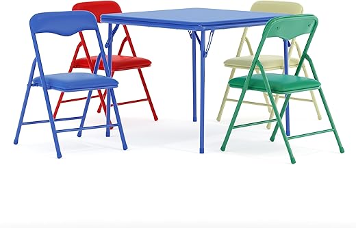 Great table and chairs set. This set is cute, colorful, and comfortable for children. Although easy to set up, it would be difficult for a child to collapse the chairs….that’s GOOD! Table and chairs are sturdy…my grandchildren love it, and so do I! The table has a soft top, so it may need a special board added so children can color and/or write on papers.