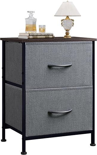 Stylish and Functional. The WLIVE Nightstand is a versatile and stylish addition to any bedroom, closet, entryway, or college dorm. This 2-drawer dresser, rated 5 stars, combines functionality with a sleek design, making it a perfect choice for small spaces.Crafted with a dark grey finish, this nightstand seamlessly blends with various decor styles, adding a touch of modern elegance to your room. The compact size makes it ideal for bedside use, while its practical design allows it to function effectively in multiple settings.The two fabric drawers offer ample storage space for your essentials, keeping your area organized and clutter-free. The drawers are easy to pull out and provide a soft, lightweight storage solution for items like clothes, accessories, or bedtime necessities.Constructed with a sturdy frame, the WLIVE nightstand ensures durability and stability. The top surface is perfect for placing a lamp, alarm clock, or decorative items, enhancing both its functionality and aesthetic appeal.Easy to assemble, this nightstand comes with clear instructions and all necessary hardware, making setup a breeze. Whether you need extra storage in your bedroom, a practical end table in your living room, or a convenient organizer in your college dorm, the WLIVE Nightstand with 2 Drawers is a fantastic choice that offers style, practicality, and durability.